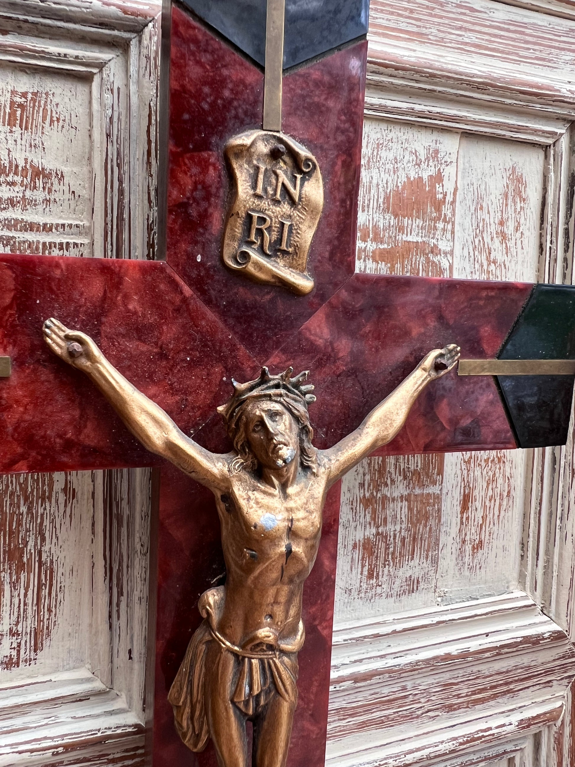 Elegant French crucifix dating from the 1920s, showcasing period craftsmanship with its brass figure mounted on bakelite and a wooden base.